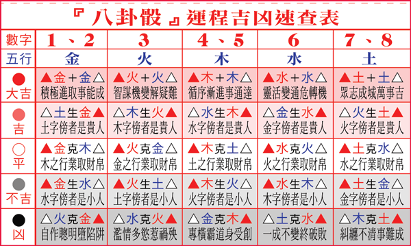 每卦各有不同「五行」(金、火、木、水、土) ,「梅花易數」就是根據卦象五行生剋變化,來預測任何事情吉凶禍福。